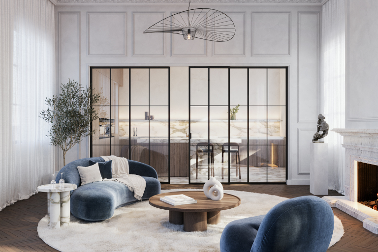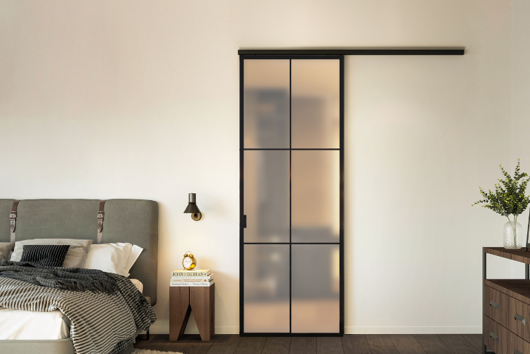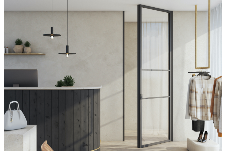 Divina dvivėrės varstomos durys – minimalistinis sprendimas, kai aktyvios ir pasyviai užrakinamos durys sudaro patogų praėjimą ir išlaiko plonus, vienodus profilius. Tarp durų integruotas (centrinis stulpelis), o pasyvios durys turi nematomą viršutinį ir apatinį skląstį su patogiu, vos matomu atlaisvinimo slankikliu. Galimas stiklo storis: 8 – 10 mm. Maks. matmenys: 3000 x 1000 mm. Minimalistinis dizainas: aktyvios ir pasyvios durys su tais pačiais siaurais profiliais. Modulinė sistema: tinka standartinei ir „nuo grindų iki lubų“ komplektacijai, lengvai trumpinama, gali būti derinama su fiksuota stiklo siena. Pasirinkimai: lipnios, laisvai pozicionuojamos skersinės; spalvos – juoda / balta / pilka.