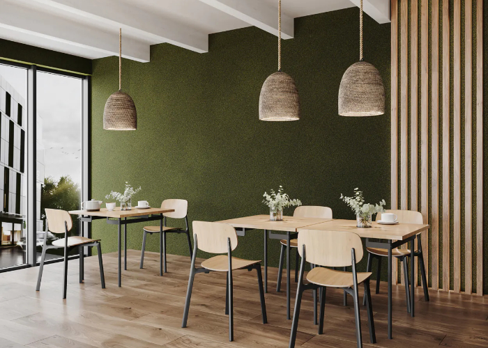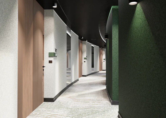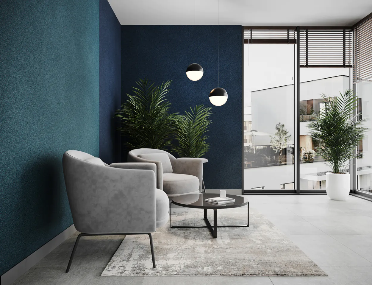 Fluffo felt (akustiniai veltinio tapetai) – tai minkšta, maloni liesti vilnonio veltinio sienų danga, kuri sugeria garsą ir padeda sumažinti „tuščią“ aidą patalpoje. Skirta dideliems plotams, kai norisi akustinio komforto be storų panelių – idealiai tinka laiptinėms, koridoriams, aukštoms svetainėms, biurams, viešbučiams ir viešosioms erdvėms.