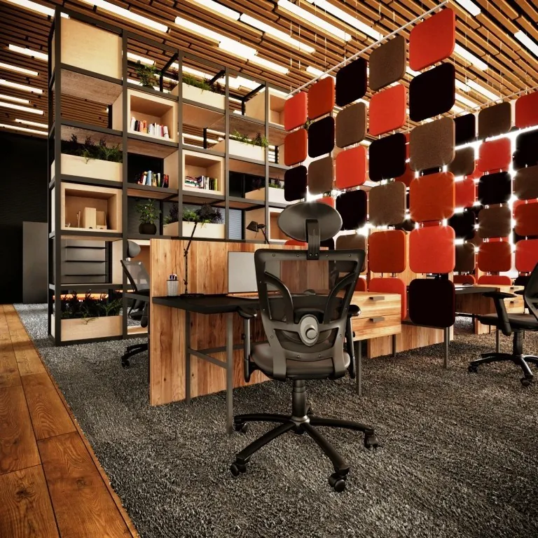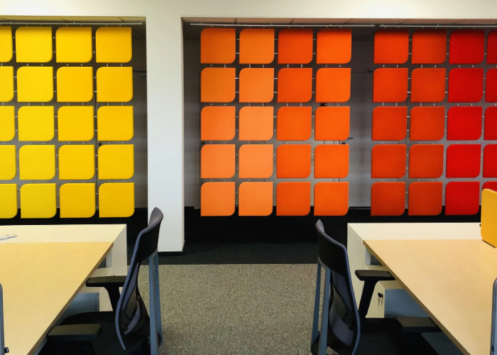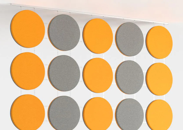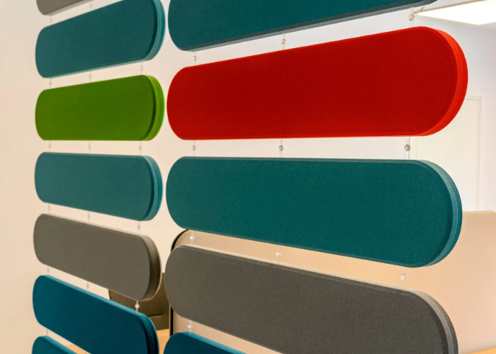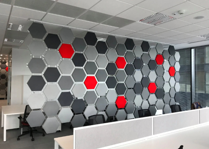 Akustinė nauda + dizainas viename: moduliniai raštai kuria tvarkingą kompoziciją ant sienos/pertvaros.