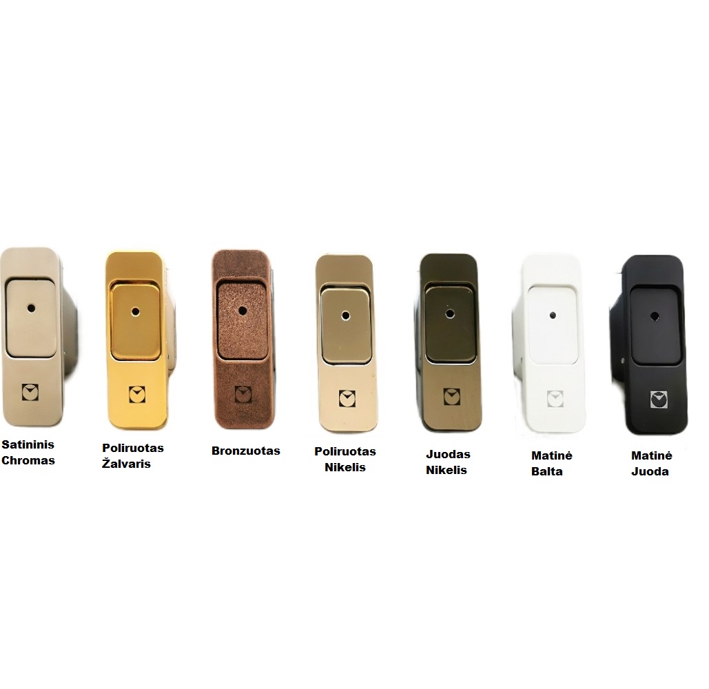 Metalinis mygtukas, galimos net 7 spalvvos ( satininis chromas, poliruotas žalvaris, poliruotas nikelis, juodas nikelis, bronzuotas, matinė balta, matinė juoda). Spalvų paletė čia.