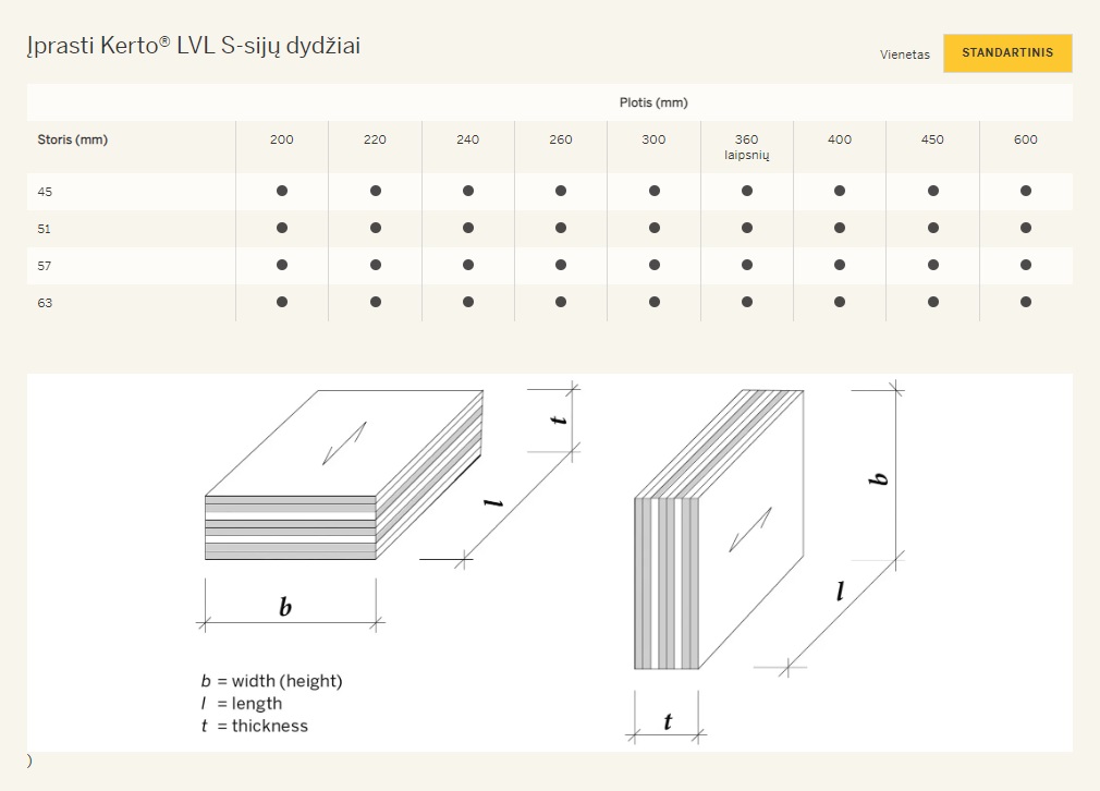 Standartai ir sertifikatai: CE ir UKCA ženklinimas pagal EN 14374, projektavimui naudojami Eurocode 5 (EN 1995) projektiniai parametrai. Atsisiųskite standartinių matmenų lentelę.